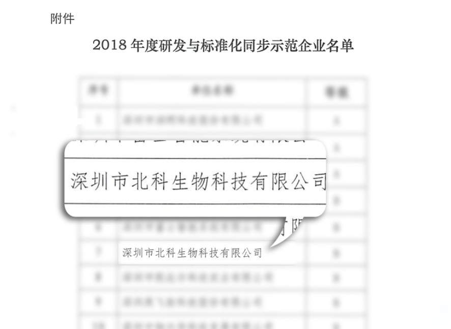2019年02月20日,深圳市市場監(jiān)督管理局發(fā)布的深市監(jiān)[2019]41號文件,深圳市北科生物科技有限公司(以下簡稱:北科生物)榮獲“研發(fā)與標(biāo)準(zhǔn)化同步示范企業(yè)”稱號。