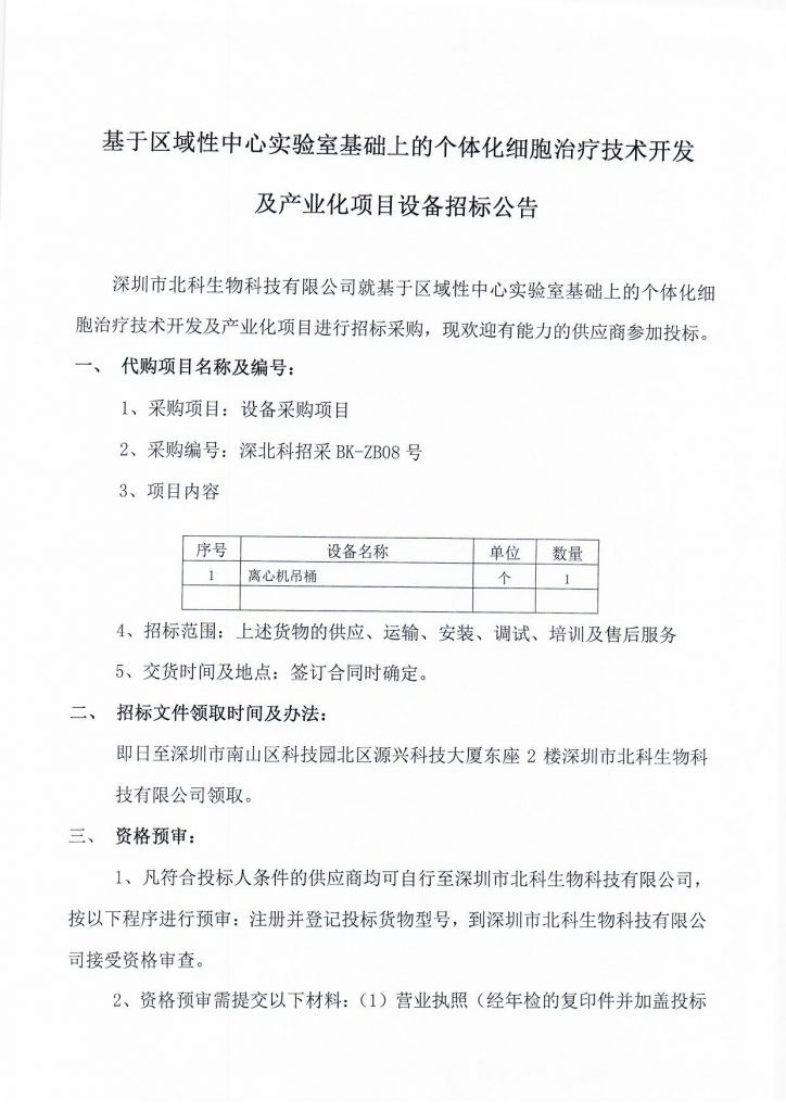 基于區(qū)域性中心實(shí)驗(yàn)室基礎(chǔ)上的個(gè)體化細(xì)胞治療技術(shù)開發(fā)及產(chǎn)業(yè)化項(xiàng)目設(shè)備招標(biāo)公告